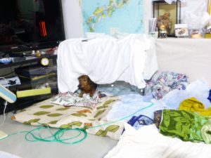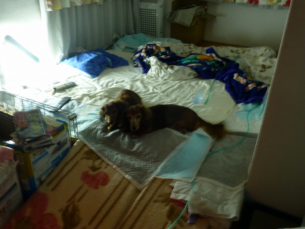 居間に移動して7:29の写真。。ハウスに入って顔出してますね。。これでは、ハウス内の酸素が効果少なくなりますが、カーテンの下にいて、両脇から外に出てくる酸素で気分良かったのかもしれませんね。。セラが、外にいたので顔出してるんでしょうね。セラは、ハウス内に入りませんでしたね。。ハウスに近づくと、楽なのわかってたのかなあ。。