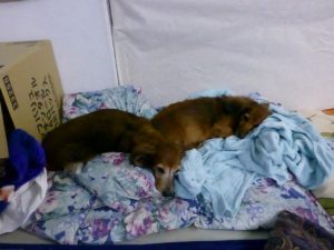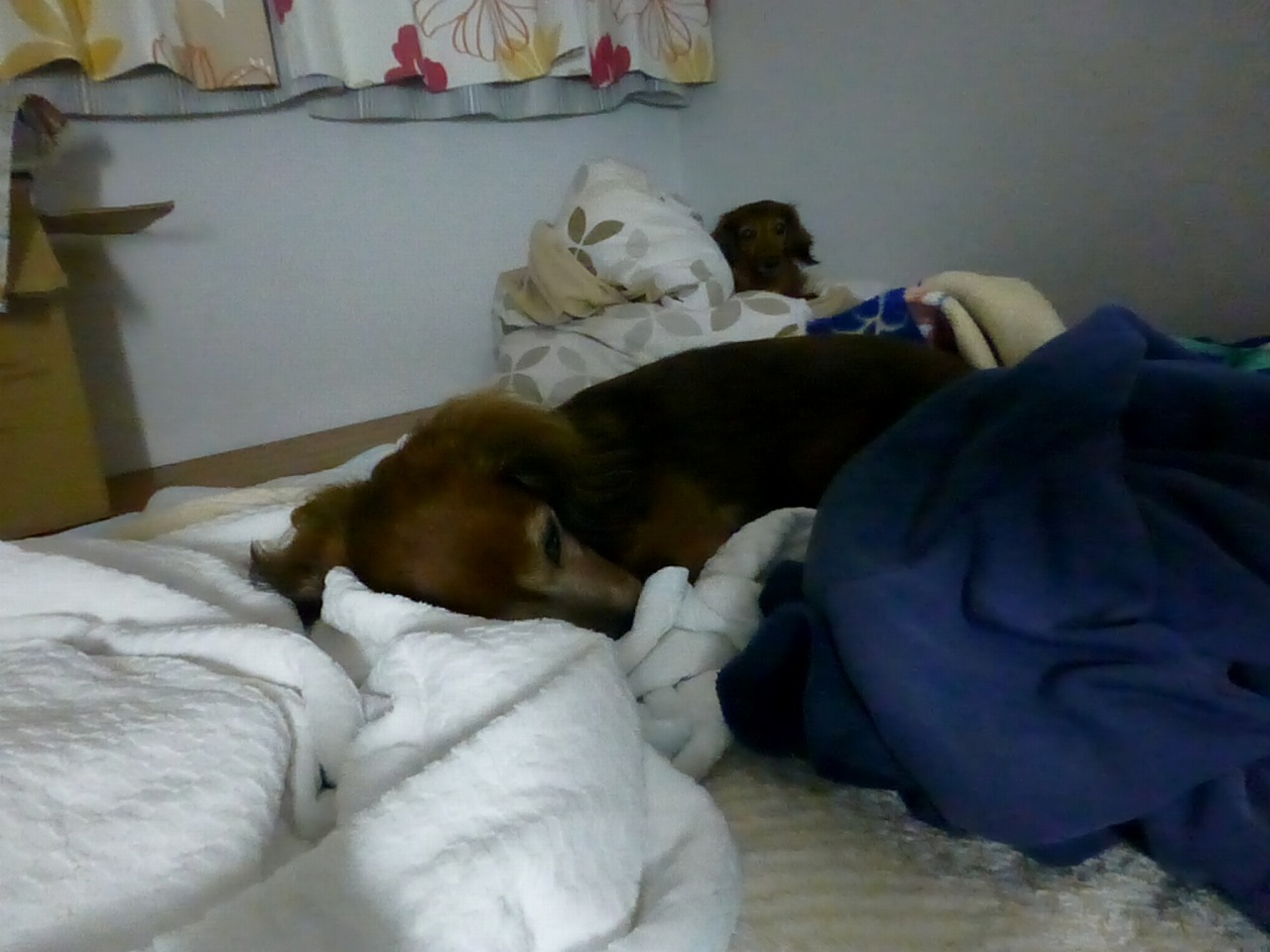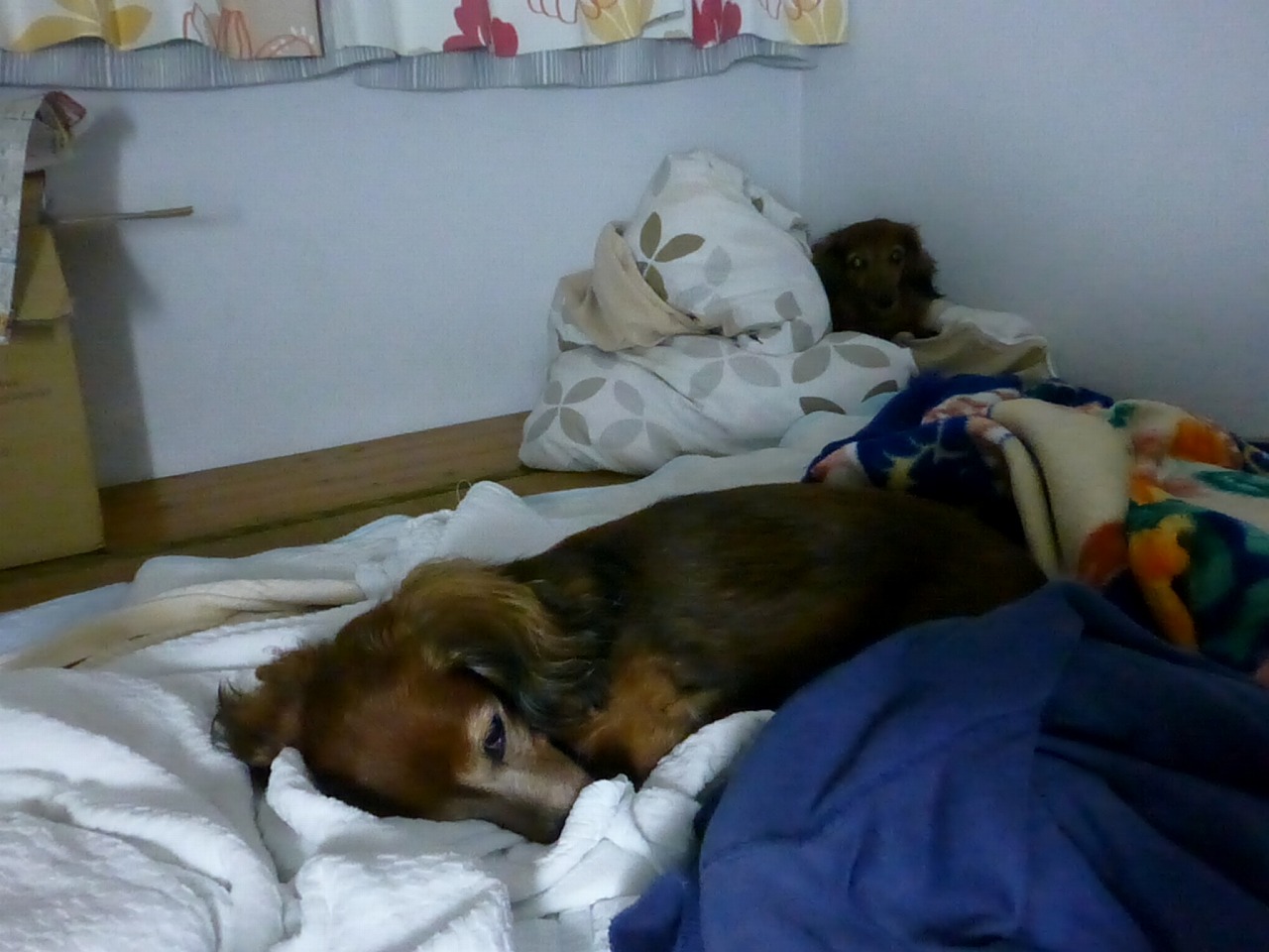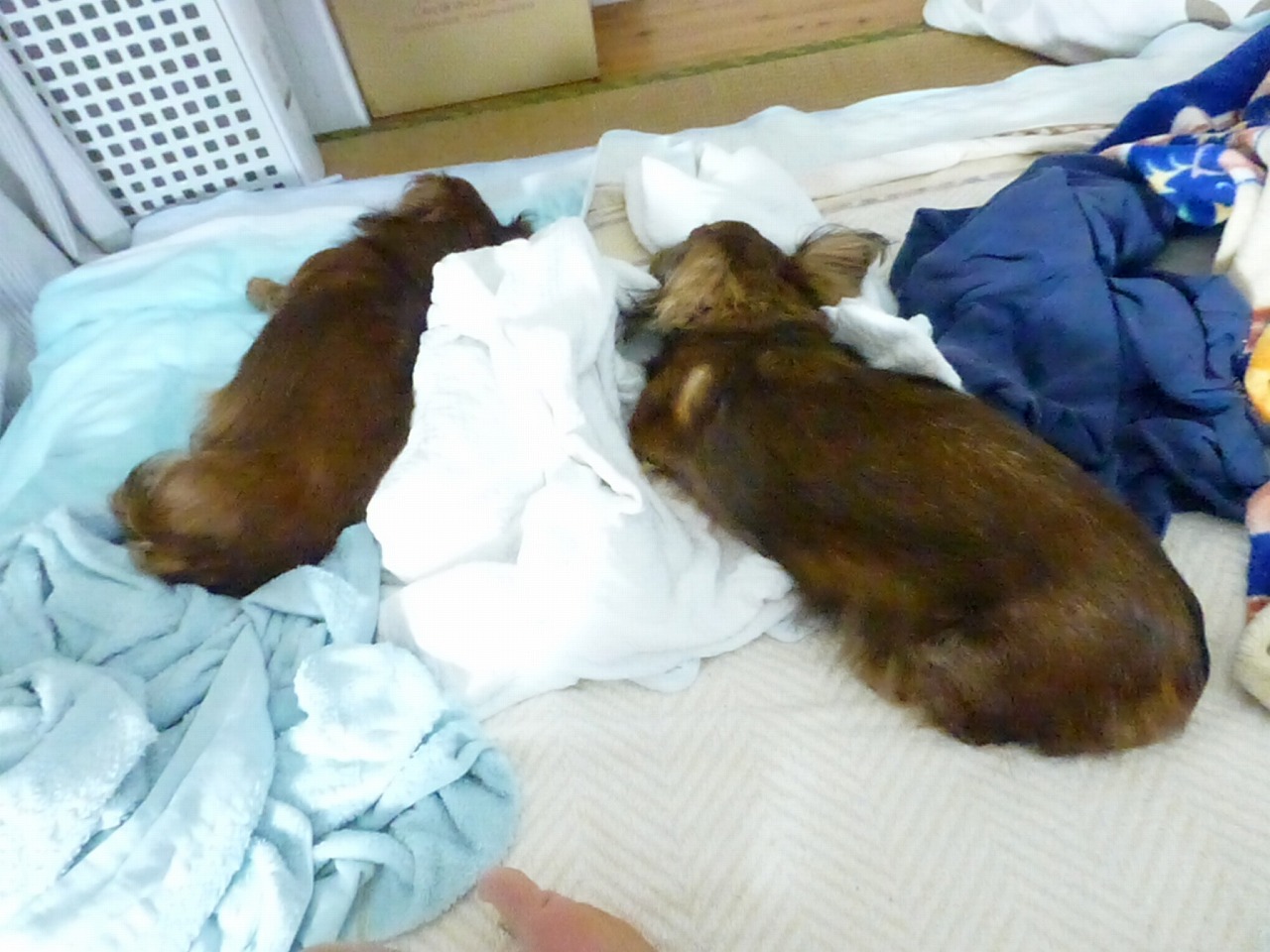 朝のチビタ。。寝床から居間に来てもやっぱりセラとグースカ。。この写真の20分程前に、朝ごはん食べてますね。。チビタ。前足を浮かせるくらい飛び跳ねて喜んでます。。チビタは柔らかい缶詰のご飯食べてますね。。。最後は、それも食べられなくかるんですが。。。流動食のわんわんカロリー。。飲ませたかったなあ。。