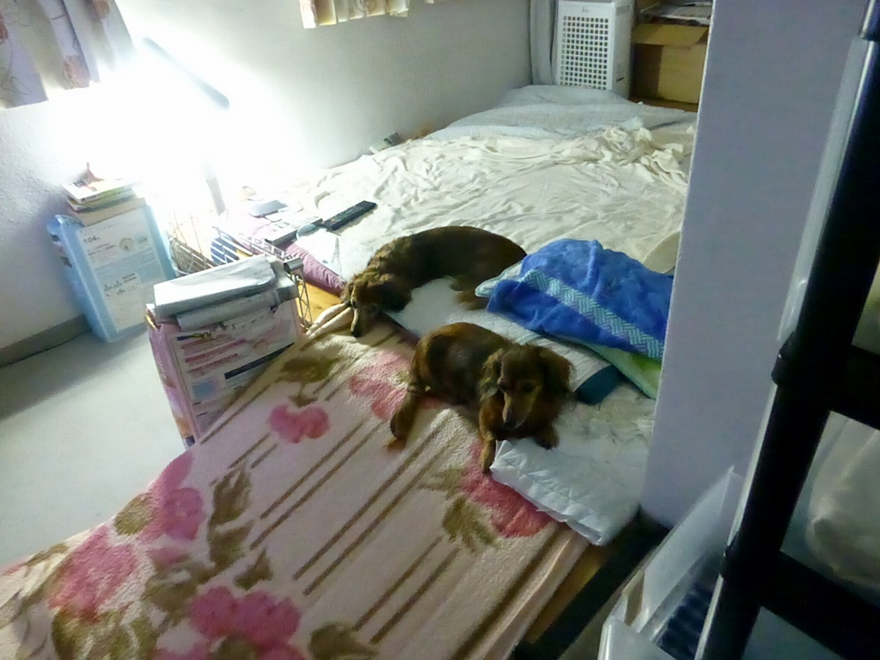 25日の写真です。同じ構図で動画も撮影してます。40枚くらい写してます朝5:08です。。吠えてる声がちょっと、かすれてますね。三枚目は、移動直前かな、いつも手前の毛布を敷いたスロープを降りていきます。毛布ひいてないと、すのこだけでは滑って登れません。降りるときは、すーっと歩かないで滑っていくことが多いです。。