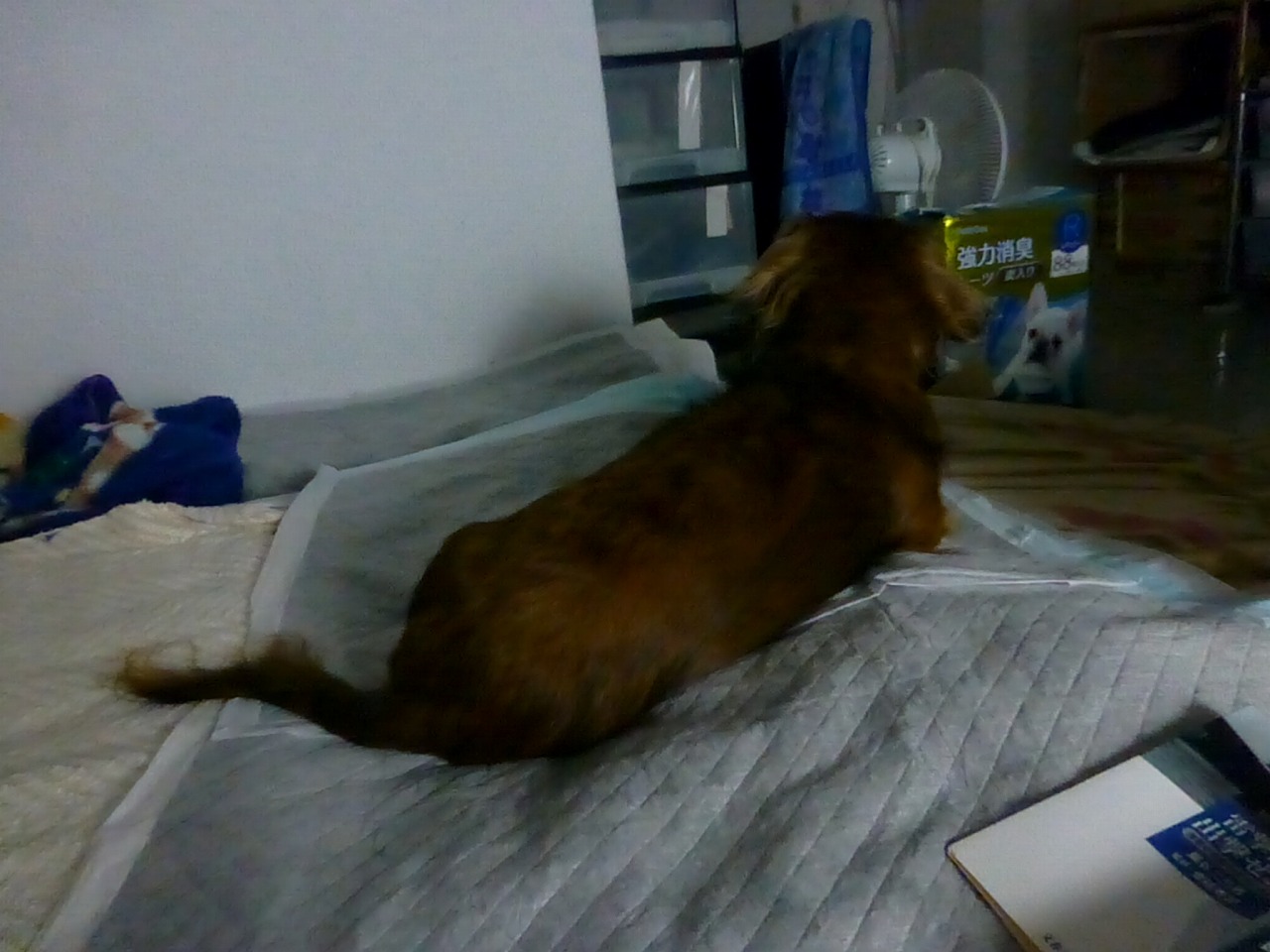 6:54のちびた。。何見てんのかなあ。。おそらく、セラがおしっこに行ったのを見送って、待ってるのかも。。。この頃、まだ、いつもの寝床で寝てますね。。おしっこシートしっかり敷いてあるなあ。。