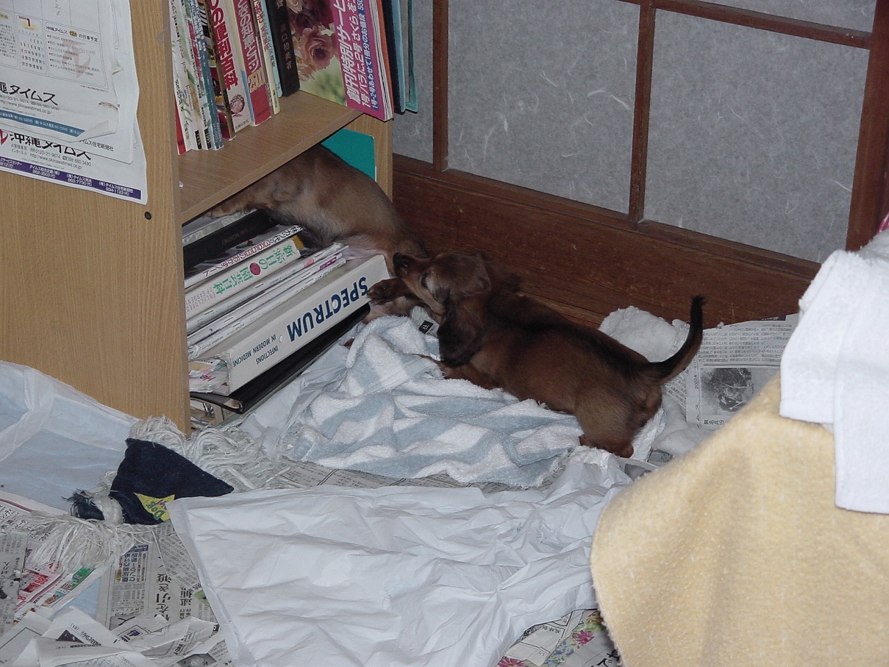 生後数ヶ月の平成14年12月23日と27日の写真載せます。。兄ちゃん二人にいつもちびたがちょっかい出していたのを思い出します。。写真のごとく、兄ちゃん達のシッポを咥えて、後ずさりして引っ張り回すのが得意でしたね。。下の写真がまさにそうですね。。それと。。一番人間にからんでくるのがちびたなんで。。人間とツーショットの写真は、ほとんどがちびたです。。この写真も婆さんがチビタを抱えて持ち上げてますね。。ほんと、三匹の中で一番にやんちゃで。。笑わせてくれました。。いつも興味持って後ついて行くもんですから、チビタがいるのに気が付かずドア閉められて、トイレや倉庫に閉じ込められてましたね。閉じ込めた人が気が付かず、チビタがいないのに気がついた小生が救出するのがよくありましたね。ほんと、油断もスキも見せられないんで、いい緊張感がある生活だったなあ。。チビタの最後は変なもの食べてしぬんだろうなあ。。と、本人にも言い聞かせてました。けど。悪性リンパ腫じゃあなあ。。