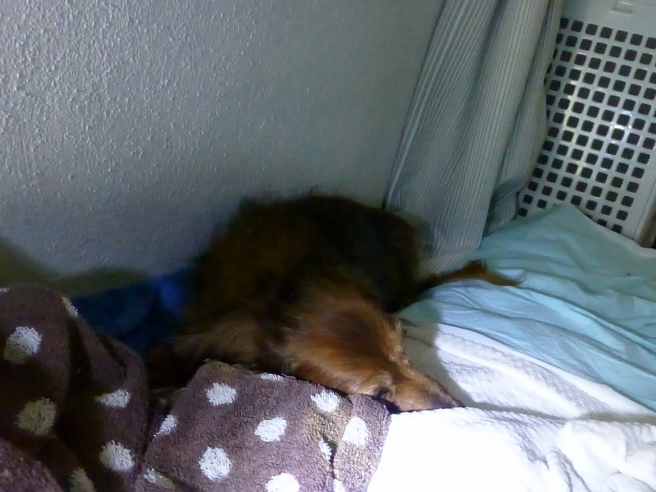 昨日朝2:55の写真と今日の6:07の寝床の写真。昨日はお気に入りの壁際で寝てますね。。
