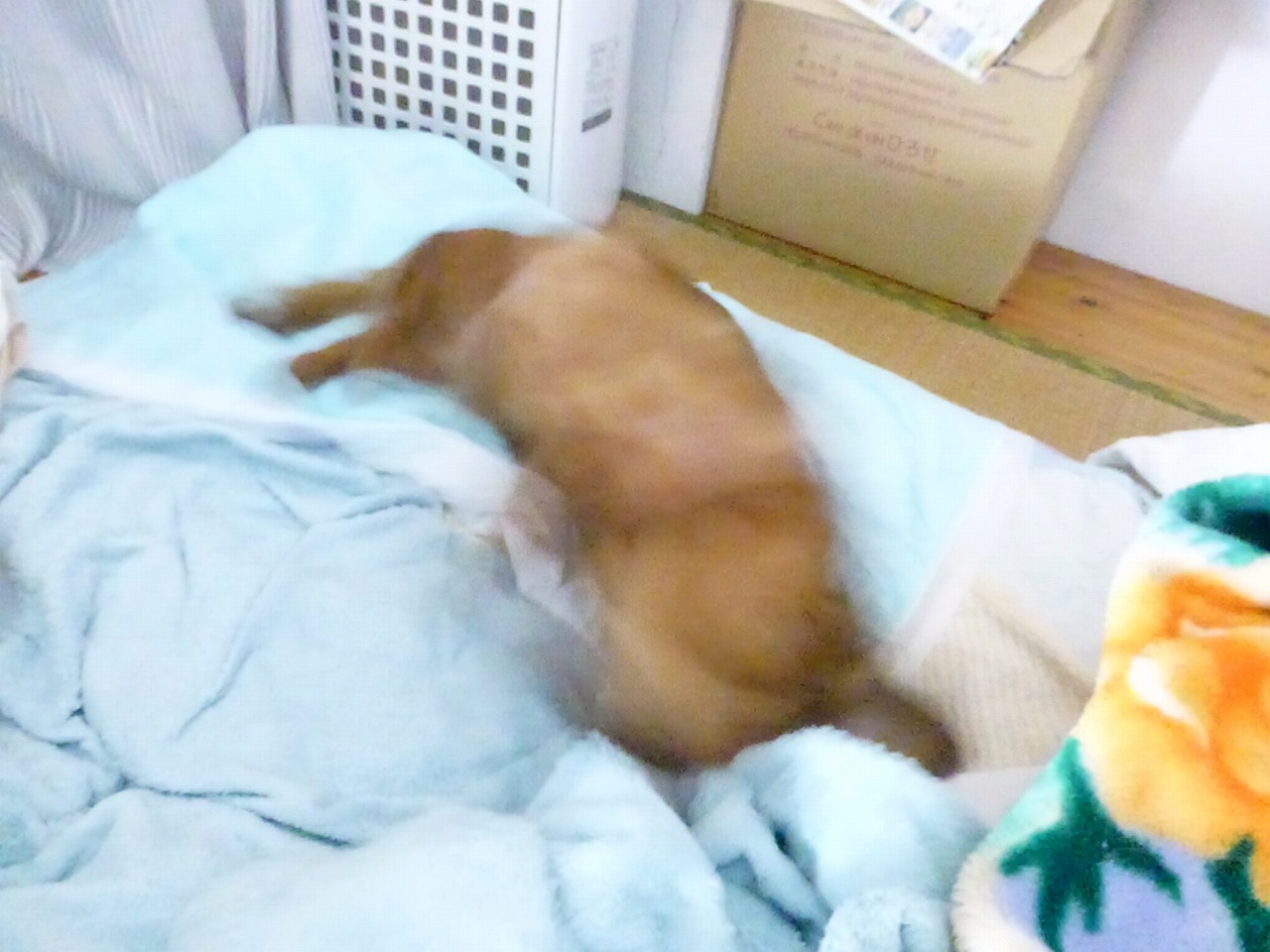 今朝の写真。。仰向けで、背中かきかきしてたんでしょうね。。ぶれまくってます。。。この頃から、ボーッとしてる写真が多いですね。。いつもは興味津々で、こんな眼をそらしてじっとしてる写真は、昔はめったに撮れなかったもんな。。。