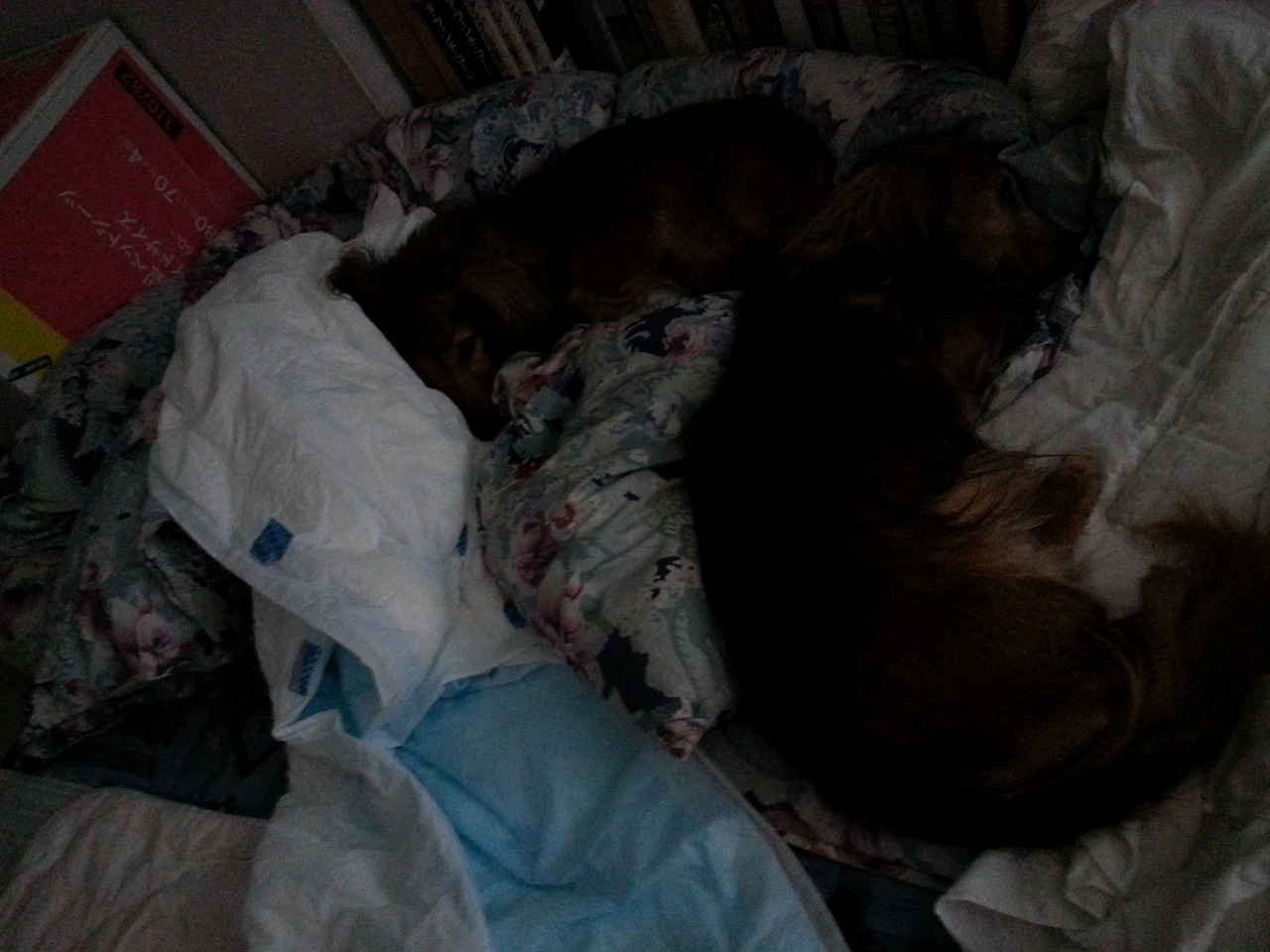 静止画は、携帯で撮影したものです。寝ているみたいですね。。真っ暗で、なんかよくわかりません。。この頃、人がいないときはケージの中にチビタ居たようです。動画で、ケージ内から勇躍出て行くのが写ってます。人が居るときは、外に出してますね。けど、おしっこ要注意で、シートが敷かれてますね。