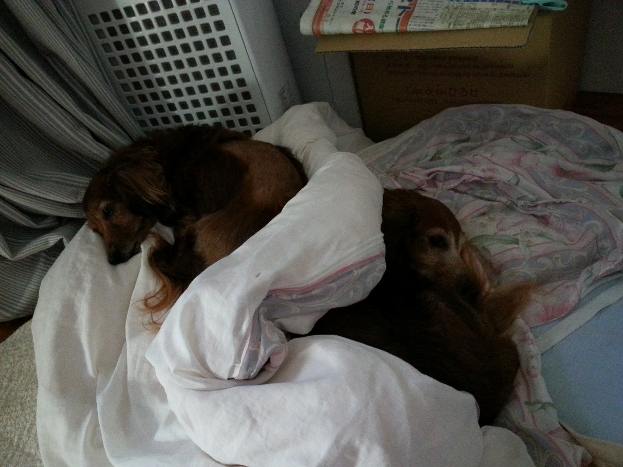 チビタの好きな空気清浄機の前。。。チビタ暑がりなので、ここでよく寝てましたね。音がいいのか、実際、風が流れているのか。。。ほんと、暑がりでした。亡くなる直前も酸素ハウス内から時々、外に出てきてましたね。亡くなる三日前、大の字になって小生が寝ていたら。。チビタが、突然右足の上に乗っかって来たんで、目を覚ましたことがあります。あのときの感触、今でも覚えてます。「自分は苦しいのに、なに平然と寝てんだよう」と、抗議された感じでした。