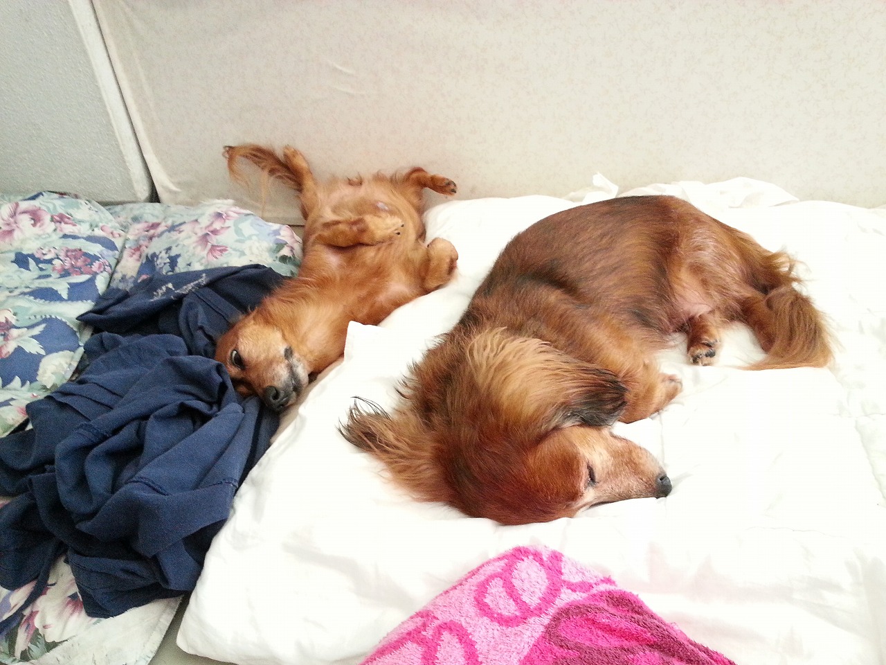 昨日、久しぶりにDAKSのタオルケット敷いて寝ました。。。チビタは、新しいシーツなど敷くと、すぐ、おしっこかけて匂いつけしてましたね。。このタオルケットもよくおしっこかけられたもんです。。ちびたか小生の匂いがついていれば、おしっこしないんですがね。。。ですから、新しく敷いたときは、ドアを閉めておくか、柵を置いて、チビタが先に寝床に行かないようにしたもんです。。。昨日は、その心配がもちろんありませんでしたね。。そんな緊張感も最近無いのに慣れましたね。。。ほんと、ちびたがいる頃は、油断も隙もない事が多くて、面白かったなあ。。。去年の今日は、JCOA沖縄研修会があって、デジカメはその写真だけですね。。。携帯に写真がありました。。。この仰向けの姿勢で少なくとも8分はいたようですね。。。暑かったのかなあ。。。。チビタは、お母さんと一緒だと満足してましたね。。。御飯食べるのもいつも先導、玄関の来客者に吠えるのも先。。。テレビで、ドアをノックするシーンがあって、それが本当に誰か来たと思って、玄関に突進して吠えるときは、傑作でしたね。。。テレビの子猫の鳴き声にもいちいち反応していたなあ。。
